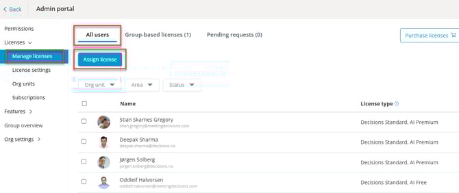 The Manage licenses tab allows you to add or remove users by clicking the blue "Assign license" button