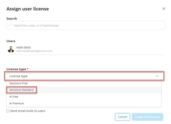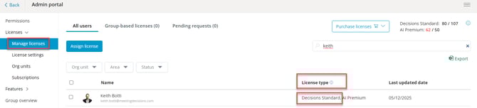 The newly assigned user will be denoted as a Decisions Standard license holder under the 'License Type' column