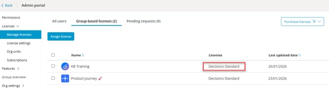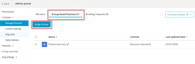 To assign license(s) go to the Decisions Admin Portal and click on the 'Manage licenses' tab that resides under the Licenses dropdown.