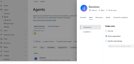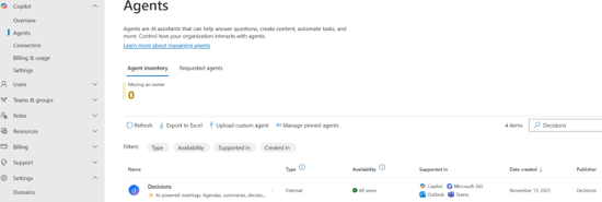 - Copilot > Agents > Agent inventory > Decisions