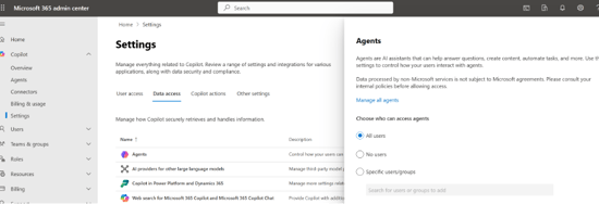 - Copilot > Settings > Data access > Agents