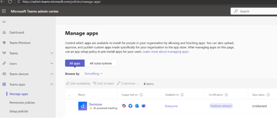 - Ensure that Decisions is available and unblocked in the Teams Admin center