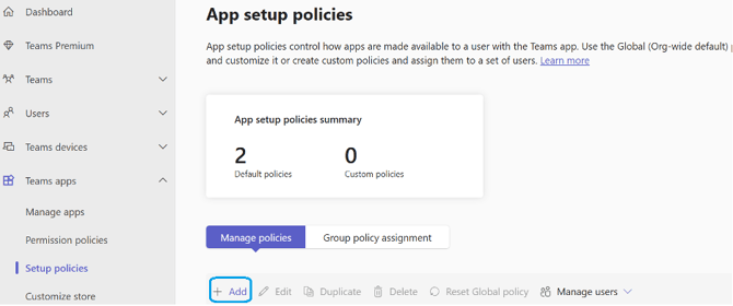 Go to Teams apps → Setup policies → Manage policies.