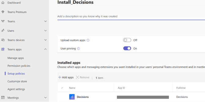 - Create/update setup policy to install Decisions in the Teams Admin center
