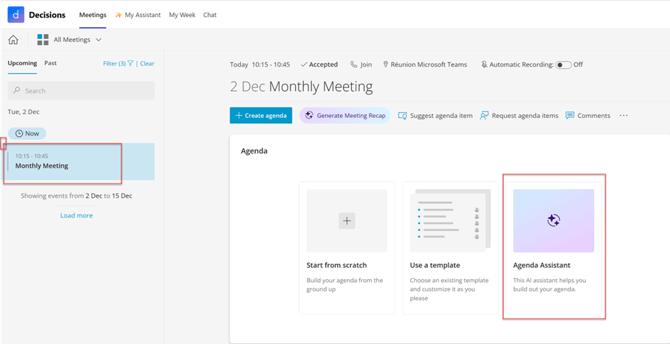 - Click Generate agenda to let Decisions AI draft the structure and timings.