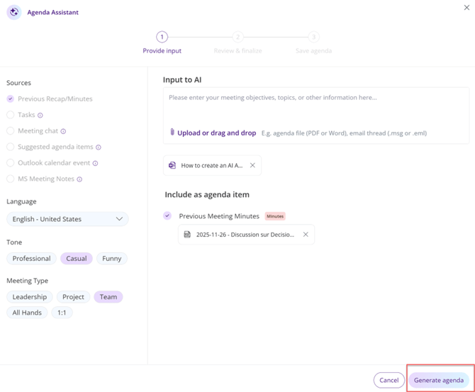 - Select sources to inform the agenda (e.g., past minutes, Word/PDF file, email thread).