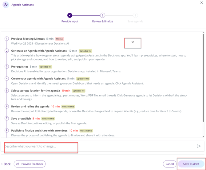 - Review the output. Edit directly in the agenda, or use the Describe changes field to request AI edits (e.g., reduce time for item 3 to 5 mins).