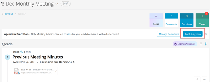 - Open Decisions and identify the meeting on your Dashboard that needs an agenda.