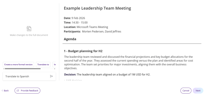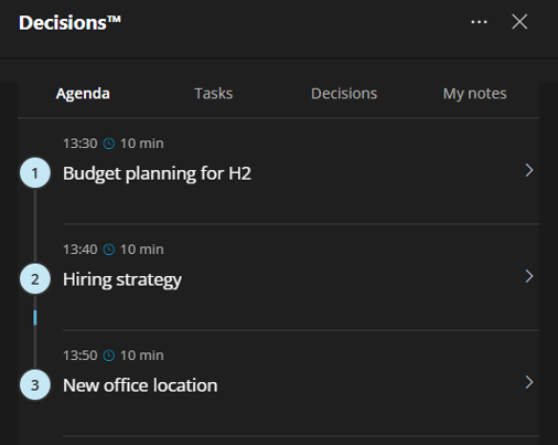 In Decisions you can see all the information from past meetings. You can use Decisions to manage the decisions you make and the tasks you assign and complete over time.