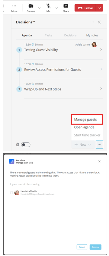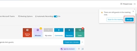 When you open an Agenda in Decisions, you’ll see a notification if there are guests in the meeting chat. From there, you can choose to manage guest access right away, as shown below: