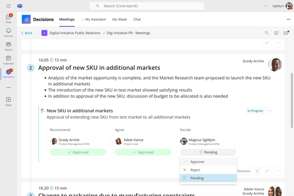 In teams with a high need for governance, accountability, and traceability, discussion in the meeting is not always enough to make a decision final. Some decisions need a more structured path before they can be treated as final. Structured approvals helps teams bring that structure into the meeting workflow by requiring approval from defined roles and keeping the approval path documented as part of the decision record.