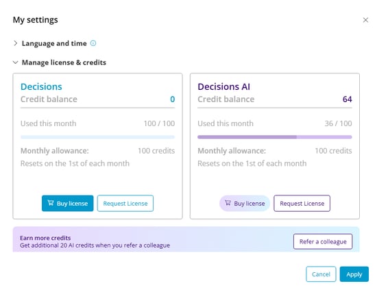 Decisions offers licensing for both core and AI functionality. This guide will work through both license types and how users can confirm their license types.